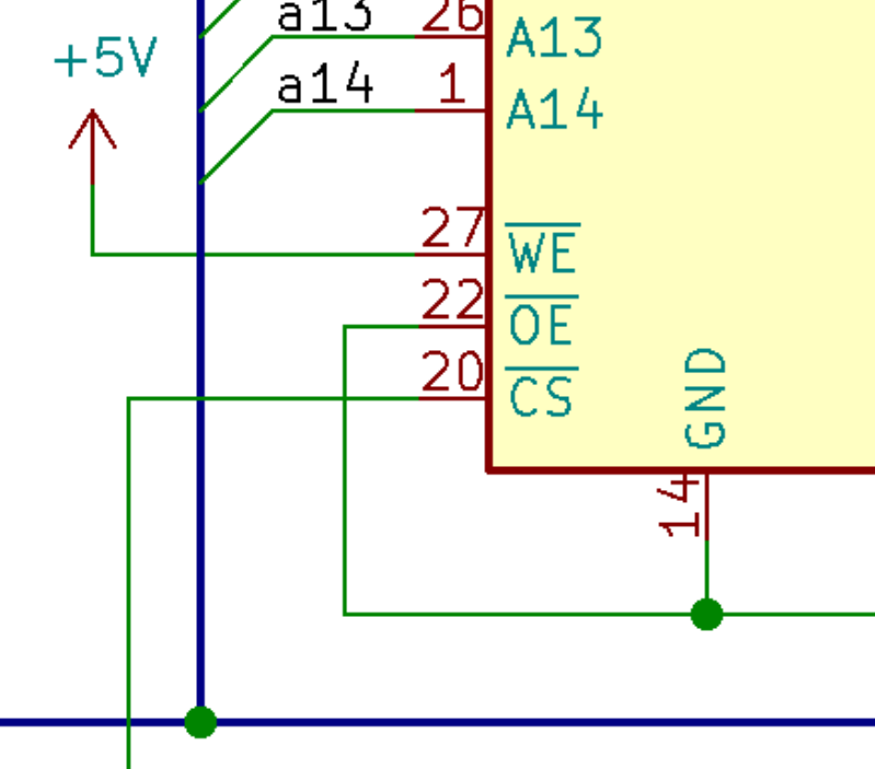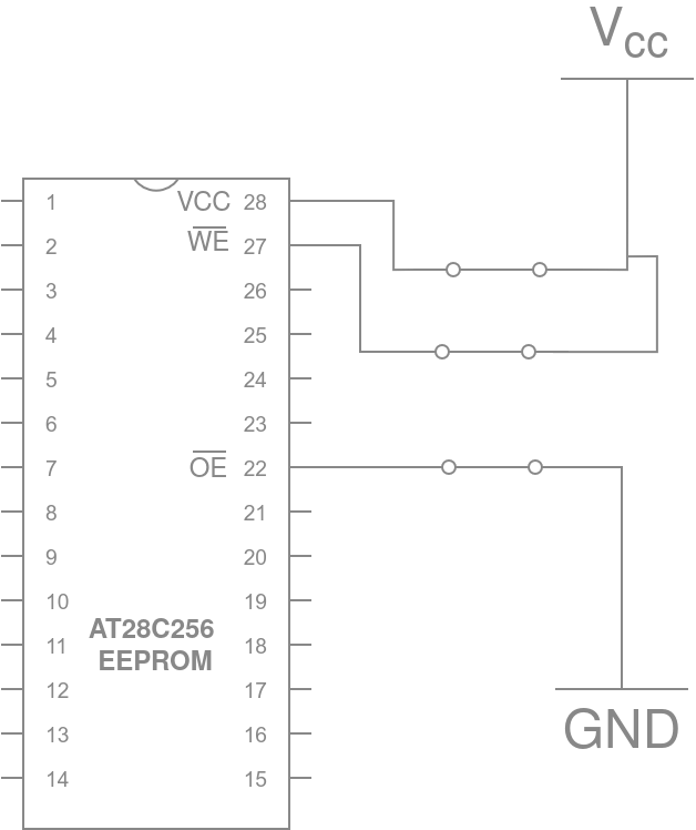 When the EEPROM programmer is writing to the chip, OE' will be set HIGH while CE' and WE' will be pulled and pulsed LOW. Therefore, we need to make sure that the WE', OE', and CE' pins aren’t always connected directly to VCC and GND on the board, as that will short them.