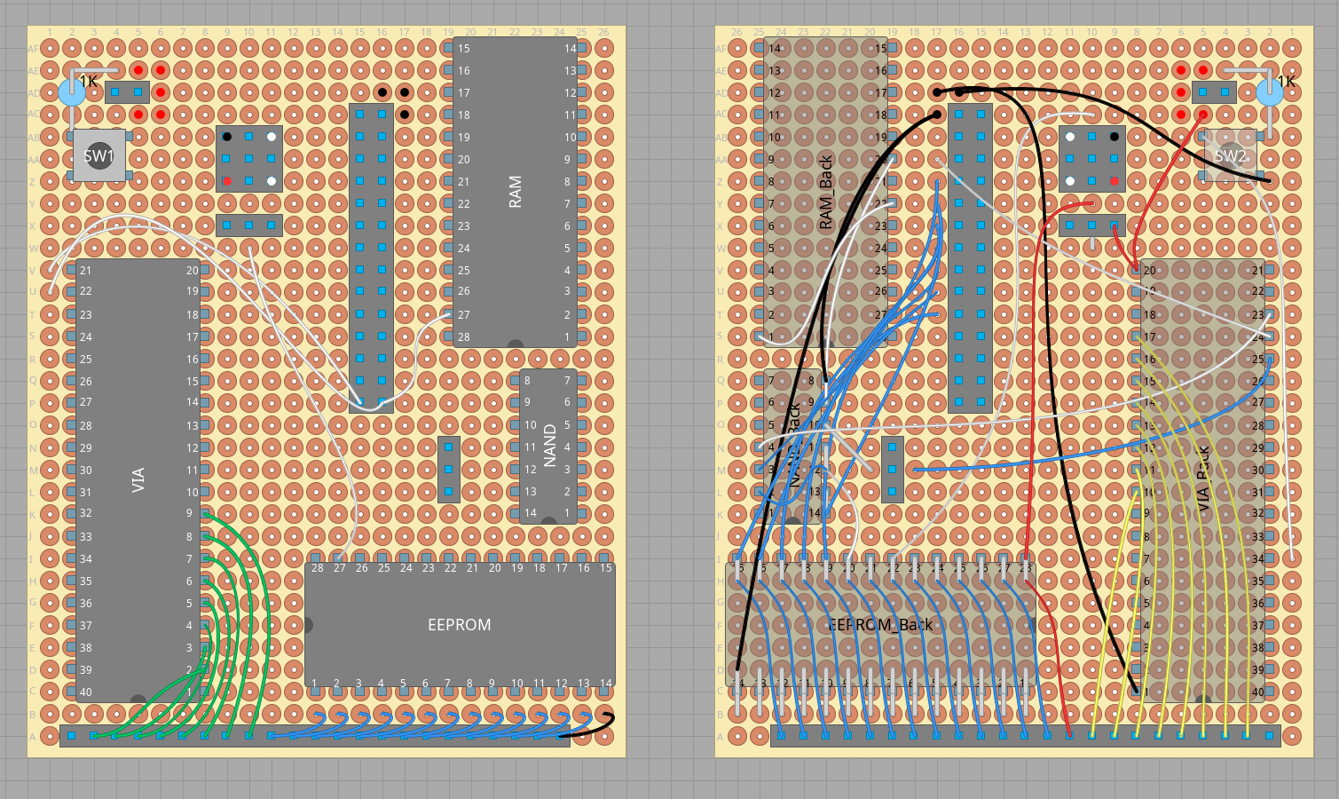 One thing that also helped greatly with the organisation and routing of wires is to route the bus through the components. Meaning that instead of connecting all chips’ address and data lines to the header directly, I connected the EEPROM to the RAM and the RAM to the VIA and then eventually to the header that is meant to come in from the 6502 board. Not all connections were specifically routed this way due to layout reasons but it made sense for a lot of them.